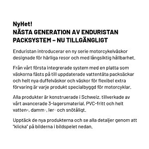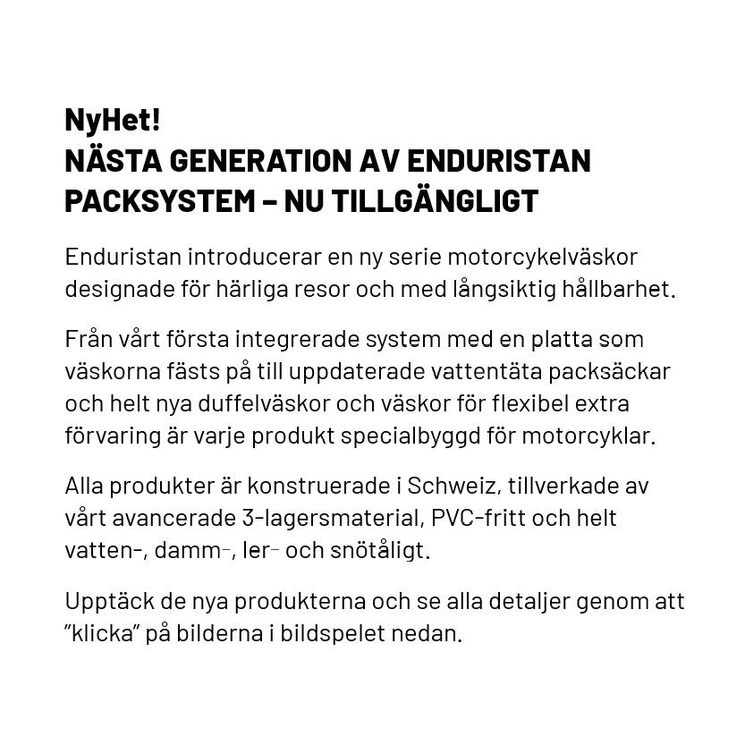 Här på Enduristan designar och tillverkar vi vattentäta motorcykelväskor av hög kvalitet. Att resa själva med motorcykel har varit en fast del av våra liv i många år. Allt vi utvecklar är baserat på denna erfarenhet vi har fått genom egna upplevelser. Resultatet är produkter med hög funktionalitet, innovativa detaljer och bästa möjliga kvalitet, allt med stöd av vår 5 års garanti. Våra produkter behöver inte överdrag för att vara vattentäta – det här är en av många detaljer som gör Enduristans produkter till de bästa på marknaden. Läs mer om vår historia här.